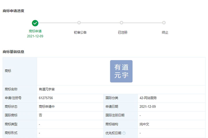 近日據(jù)天眼查顯示網(wǎng)易有道信息技術(shù)(北京)有限公司申請(qǐng)注冊(cè)“有道元宇宙”商標(biāo),國(guó)際分類涉及教育娛樂(lè)等,目前商標(biāo)狀態(tài)均為申請(qǐng)中。
