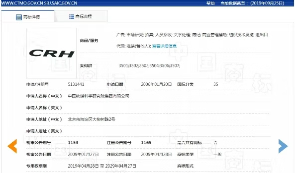 “CRH”商標(biāo)被撤三2006年01月20日,中國(guó)鐵道科學(xué)研究院集團(tuán)有限公司(下稱鐵科院)申請(qǐng)注冊(cè)了第5131441號(hào)35類的“CRH”商標(biāo),該商標(biāo)于2009年04月28日注冊(cè)成功,核準(zhǔn)使用在廣告; 市場(chǎng)研究; 拍賣; 人員招收; 文字處理; 簿記; 商業(yè)管理輔助; 組織技術(shù)展覽; 進(jìn)出口代理; 推銷(替他人)等服務(wù)上。